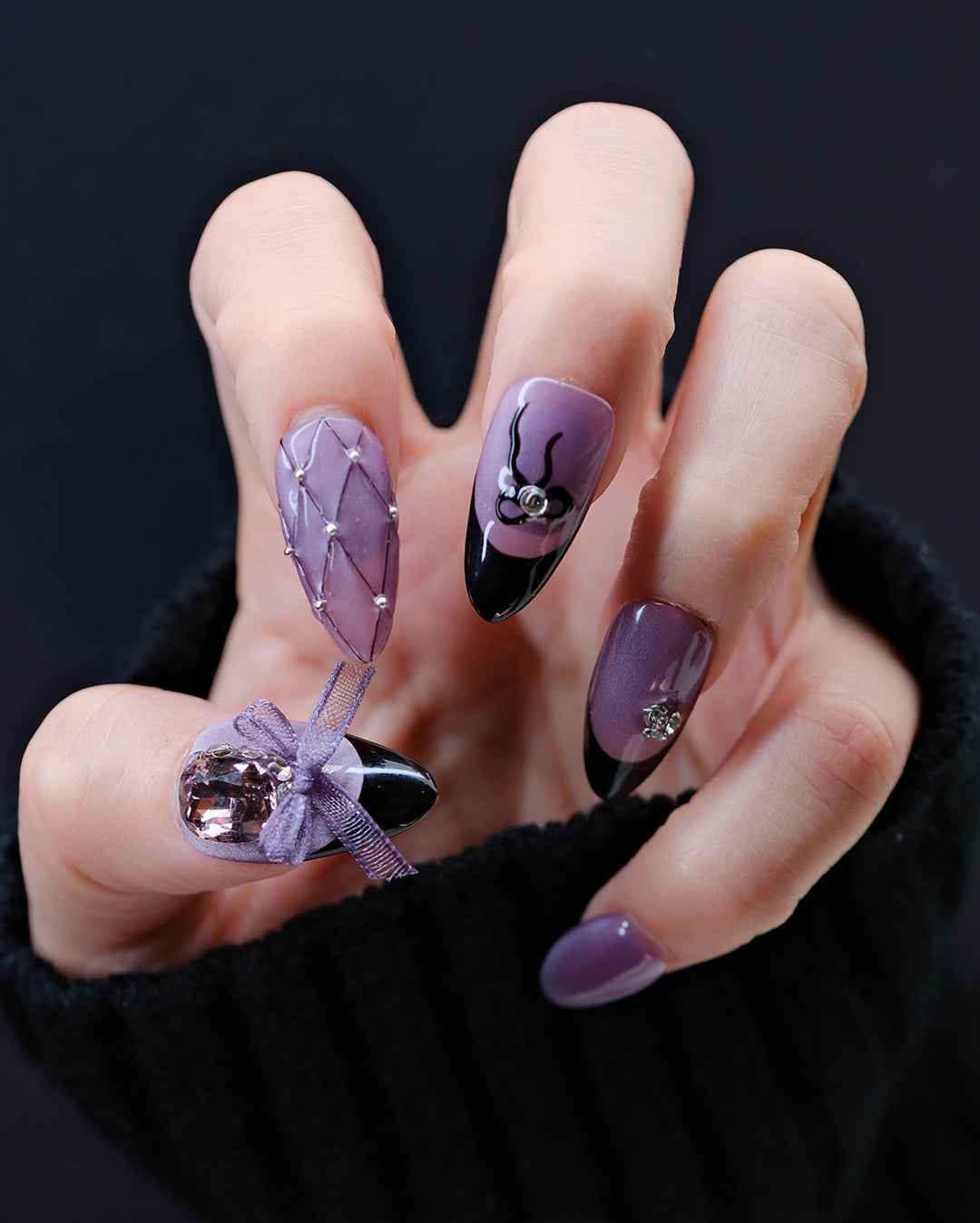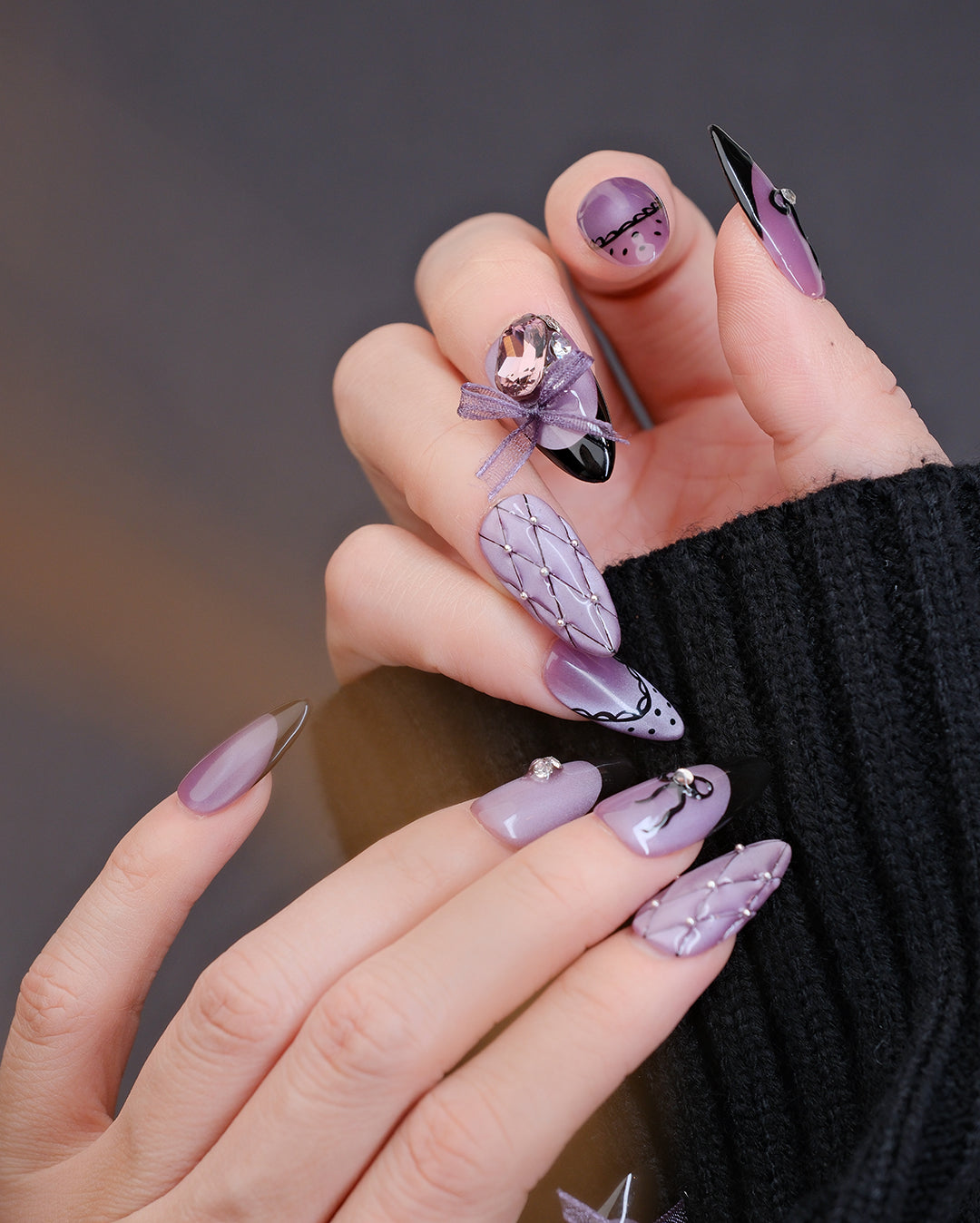 Romantic yet rebellious – these purple gothic lolita press-on nails feature crystal bows, corset-style accents, and black tips. 100% handmade with FDA-approved, safe materials, they’re perfect for a dark princess vibe.