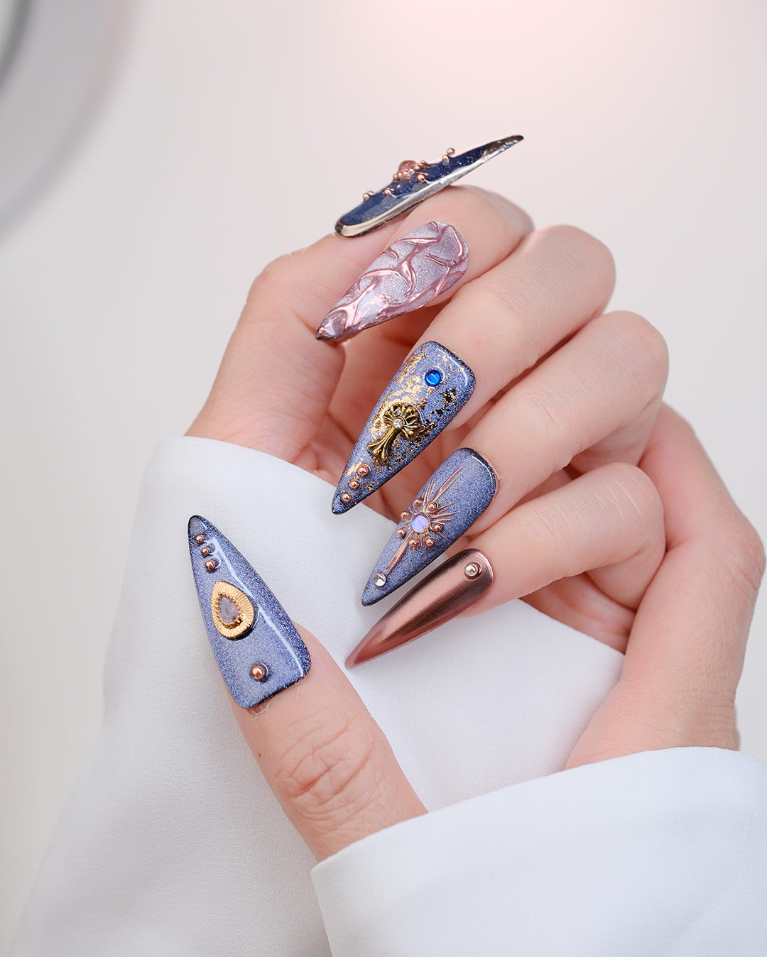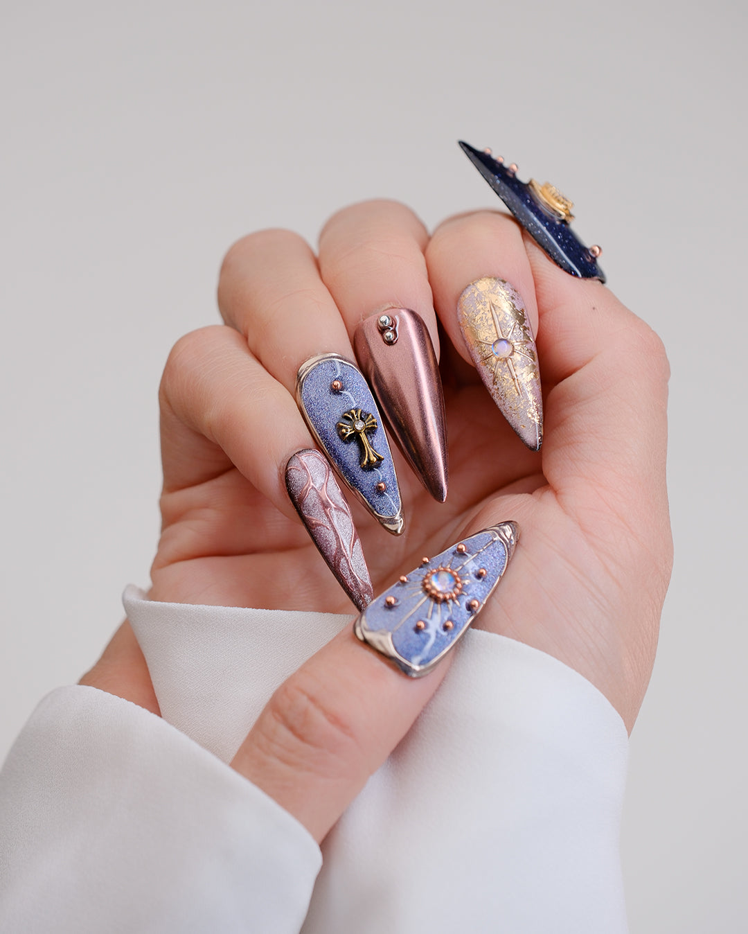 Step into the cosmos with these purple & rose gold galaxy press-on nails, featuring celestial accents, crosses, and mystical textures. 100% handmade with FDA-approved safe materials, they’re nails with cosmic energy.
