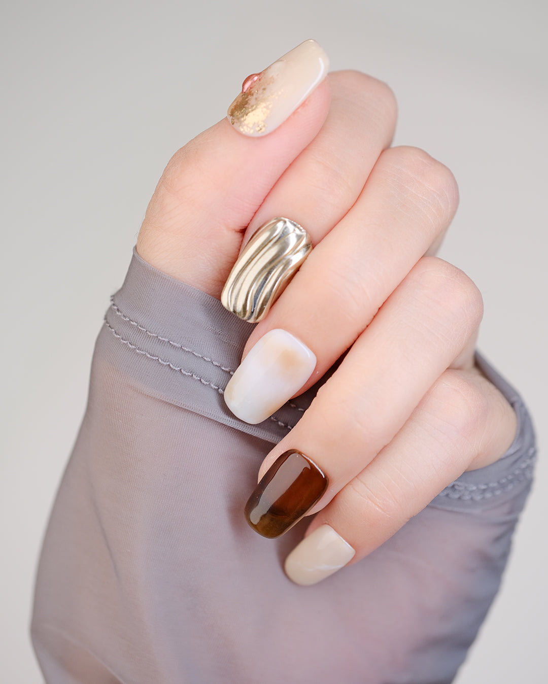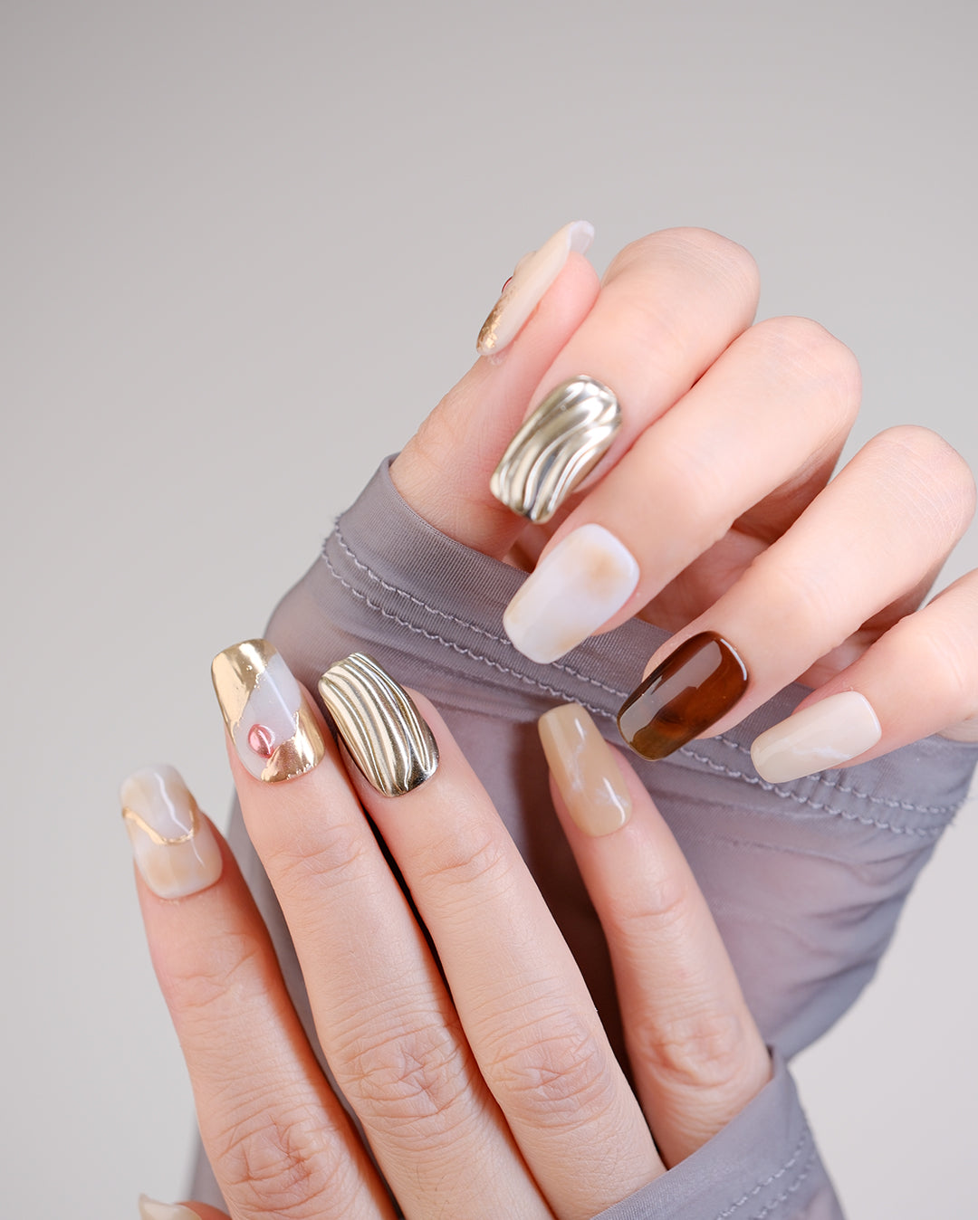 Sophisticated and timeless – these nude & gold marble press-on nails blend creamy neutrals with metallic waves for a modern luxury look. 100% handmade with FDA-approved safe materials, they’re the perfect balance of elegance and edge.