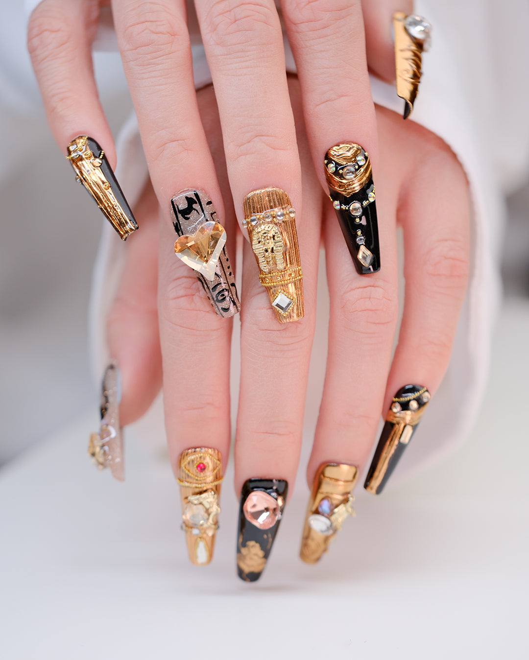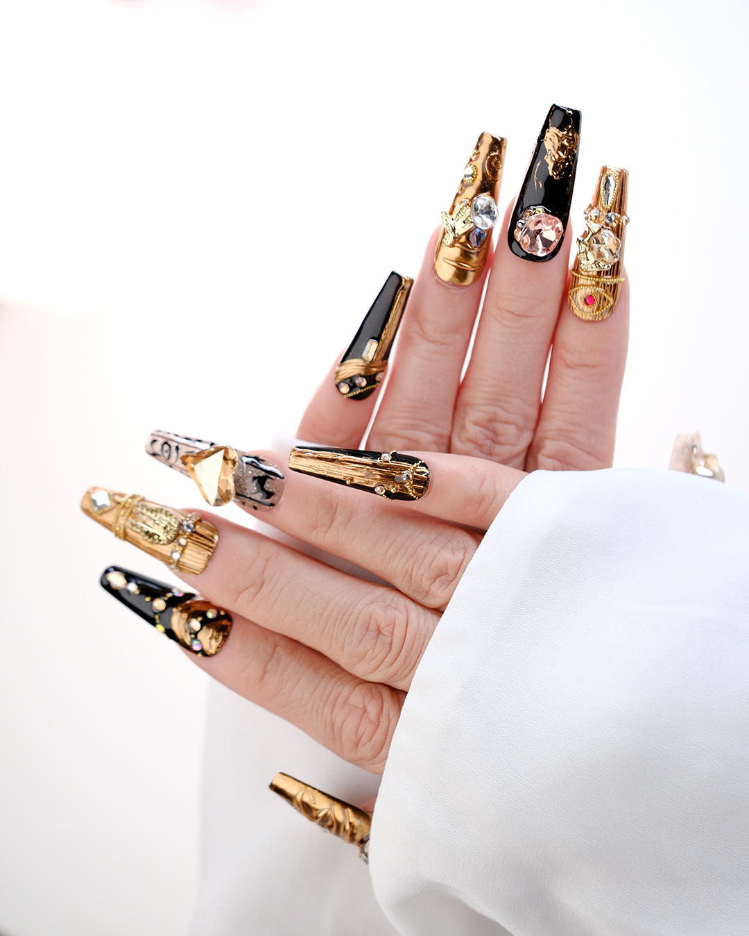Make every gesture unforgettable with these handmade rose gold & black luxury press-on nails, designed with gemstone accents and crafted from FDA-approved safe materials. Perfect for parties, photoshoots, and nights when ordinary is not enough.